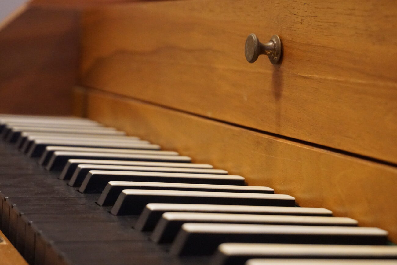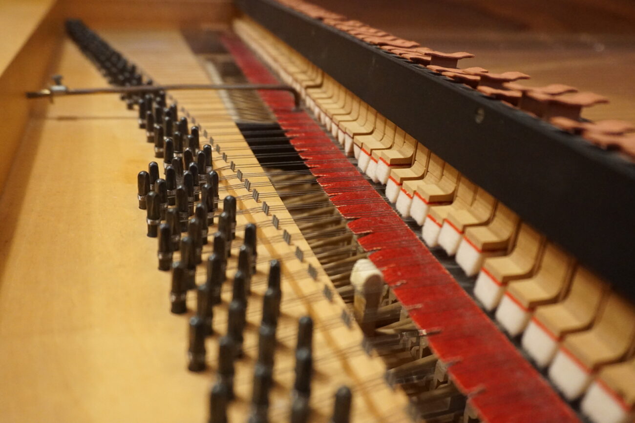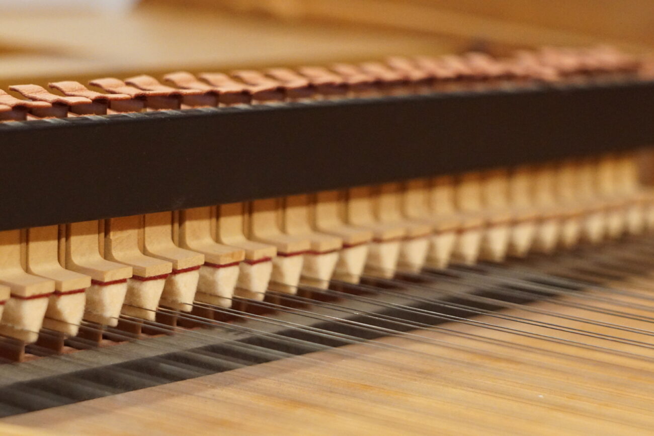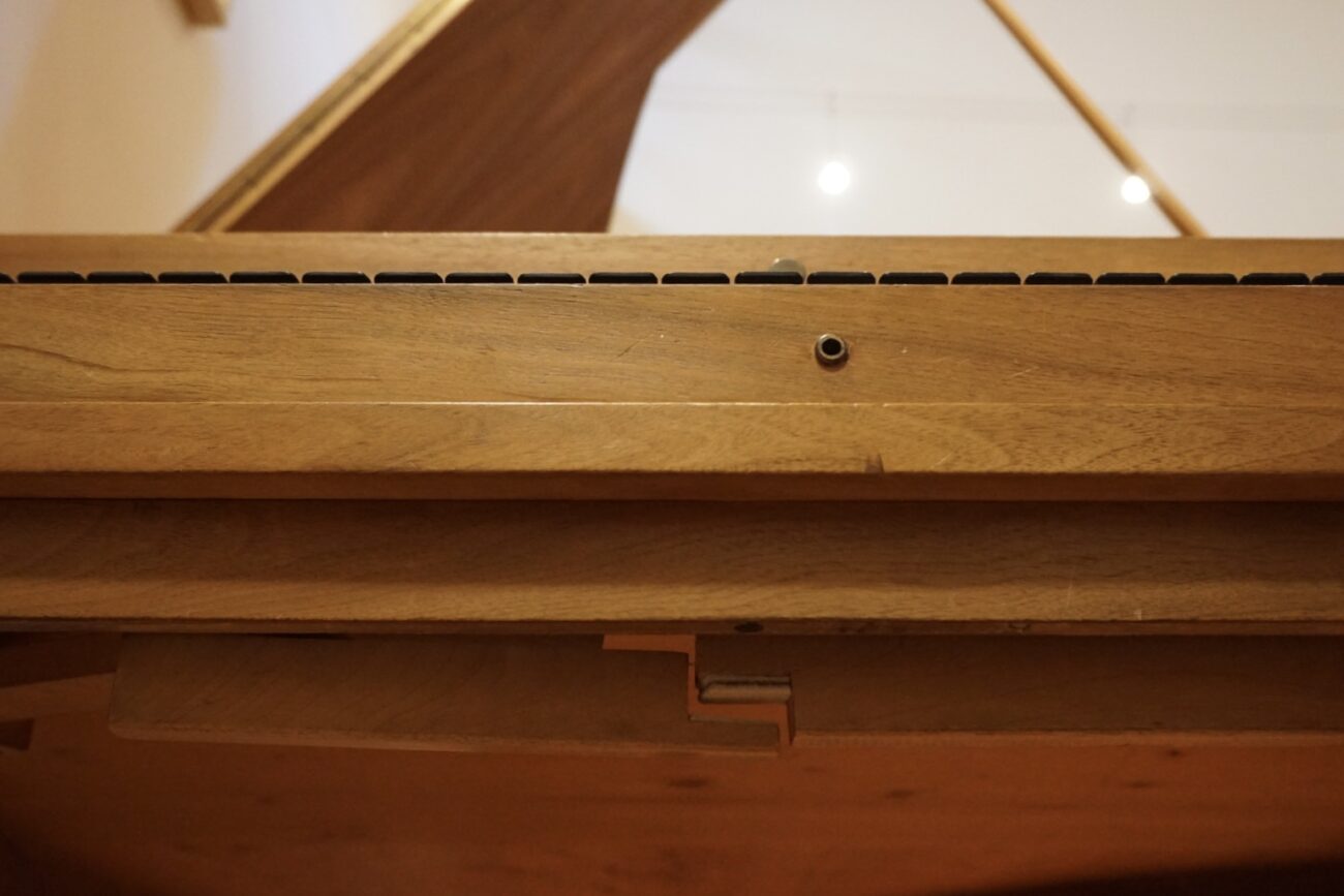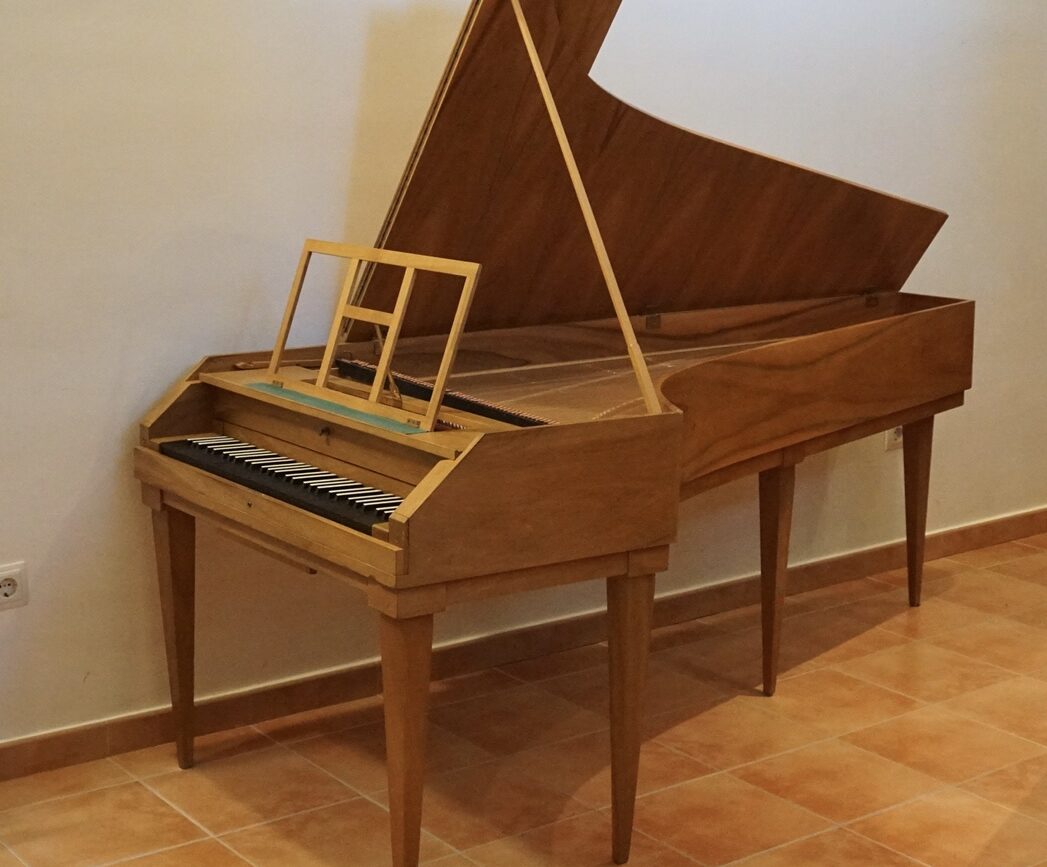 Instrumento de mecánica vienesa con registro de sordina y dos pedales de rodilla (resonancia agudos y teclado completo).